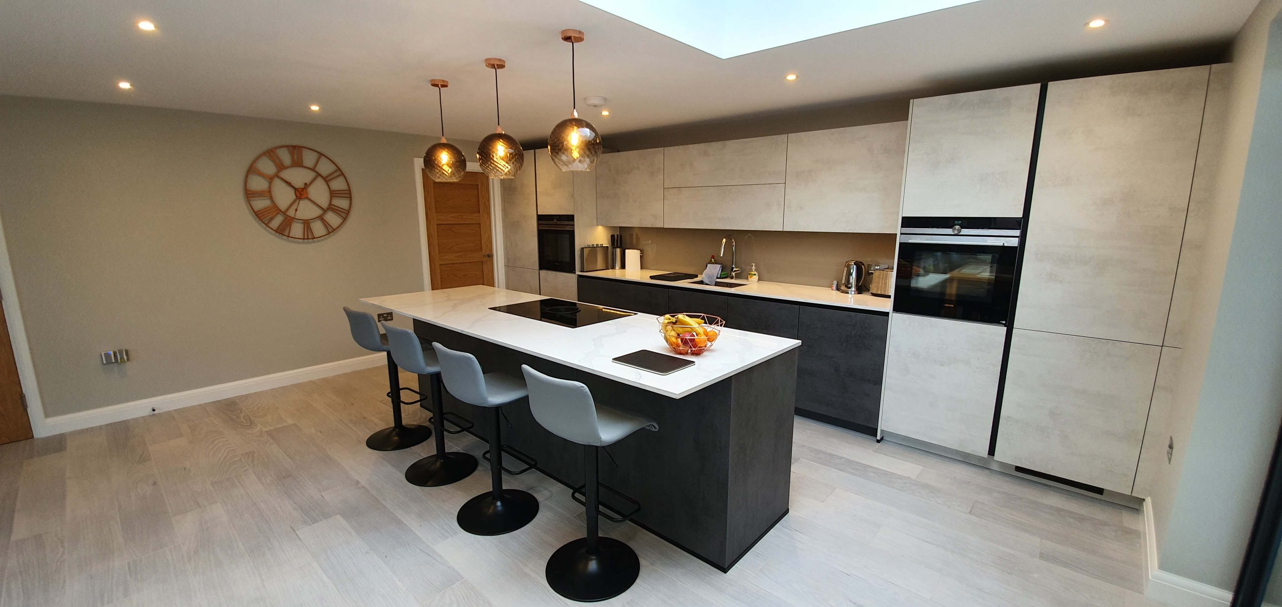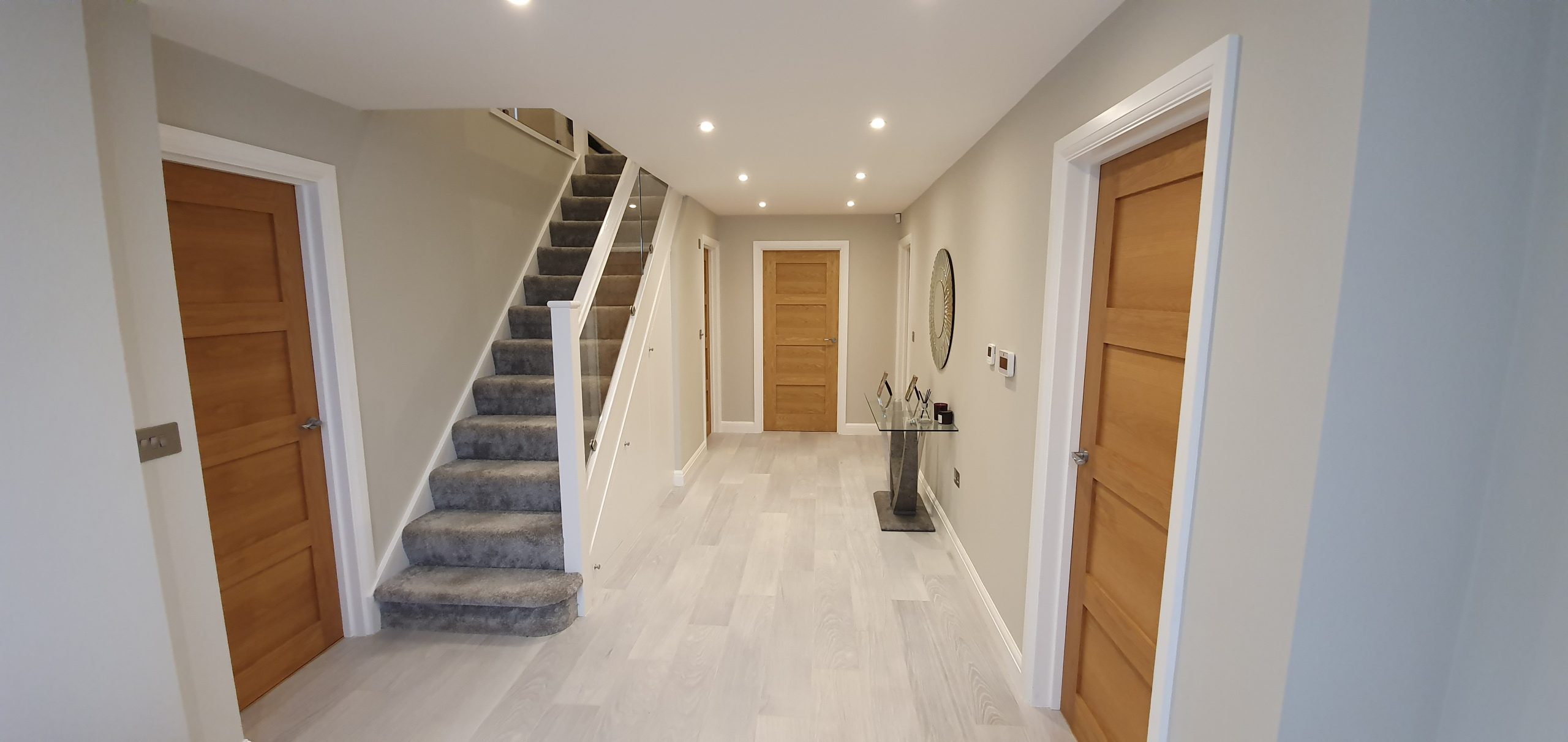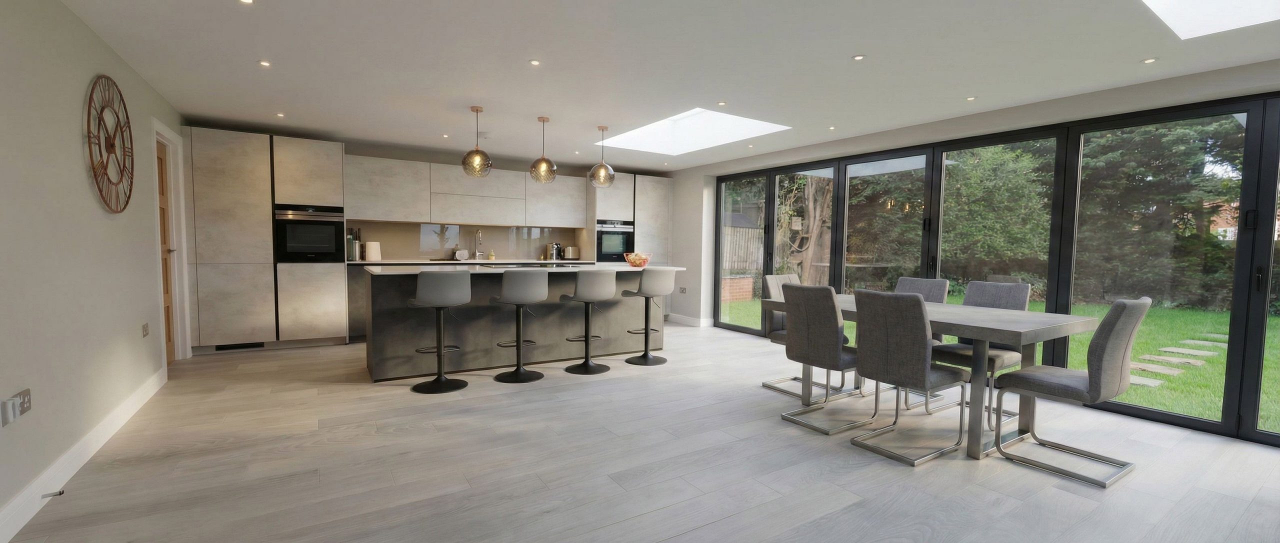 Project Scope: This project involved the complete renovation of a detached 1980s family home in Elstree and Borehamwood, transforming a compartmentalized layout into a high-specification modern residence. The centrepieces of the renovation are a substantial rear extension that houses an expansive open-plan kitchen, dining, and living area, and a redesigned central hallway that offers seamless access to two reception rooms and the newly integrated underground garage.